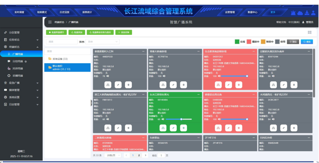 多形式广播发布:支持文件播放、文字转语音、电台直播、采播等多种形式,可针对不同区域精准推送内容(如长江十年禁渔政策宣传、应急预警通知)。